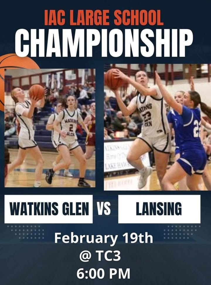 Watkins Glen Central School District says the IAC Large School Championship game will feature Watkins Glen against Lansing on Feb. 19 at Tompkins Cortland Community College (TC3) with a 6 p.m. tip-off; tickets are digital passes only through GoFan, gates open one hour before, Section IV and IAC passes will be accepted, screenshots will not be accepted as valid tickets, and tickets are available at gofan.co/event/6113185?schoolId=NY87583.