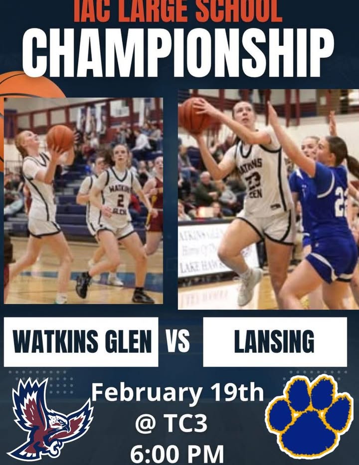 The Watkins Glen Central School District in Watkins Glen says the IAC Large School Championship game will feature Watkins Glen against Lansing on February 19 at Tompkins Cortland Community College (TC3). Tip-off is scheduled for 6:00 PM.